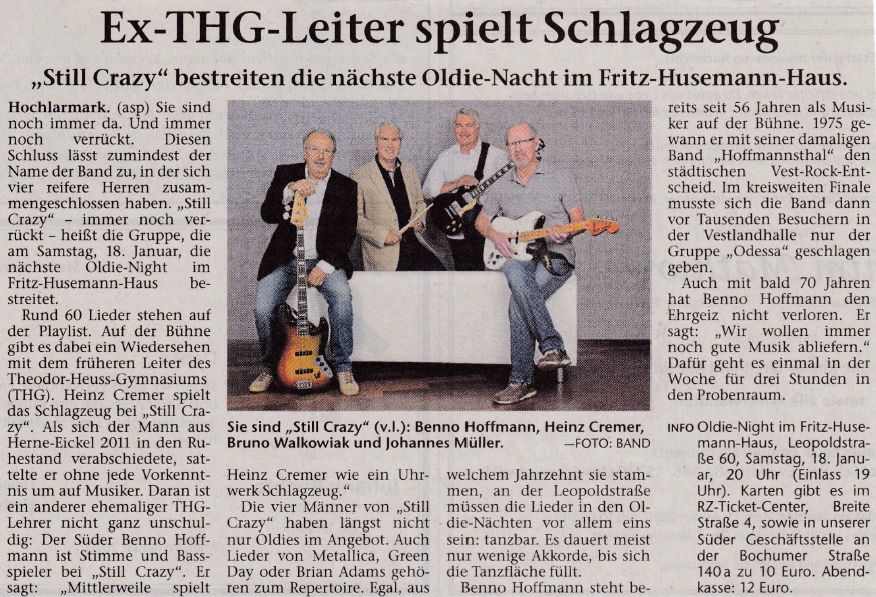 Wieder einmal hatte man die Eickeler VINOthek für ein besonderes Ereignis ausgewählt. Ein Bandmitglied von Still Crazy, nämlich Hans, hatte ca. 40 Verwandte und Freunde eingeladen, um seinen 70. Geburtstag nachzufeiern. Wieder war die Location gut gefüllt und es war Hans‘ Wunsch, die Gäste mit den Coversongs von Still Crazy zu beschallen und zu unterhalten. Dank flexibler Gestaltung der Songauswahl gelang das Vorhaben vorzüglich, sowohl den jüngeren als auch den älteren Gästen einen vergnüglichen und kurzweiligen Abend zu gestalten.