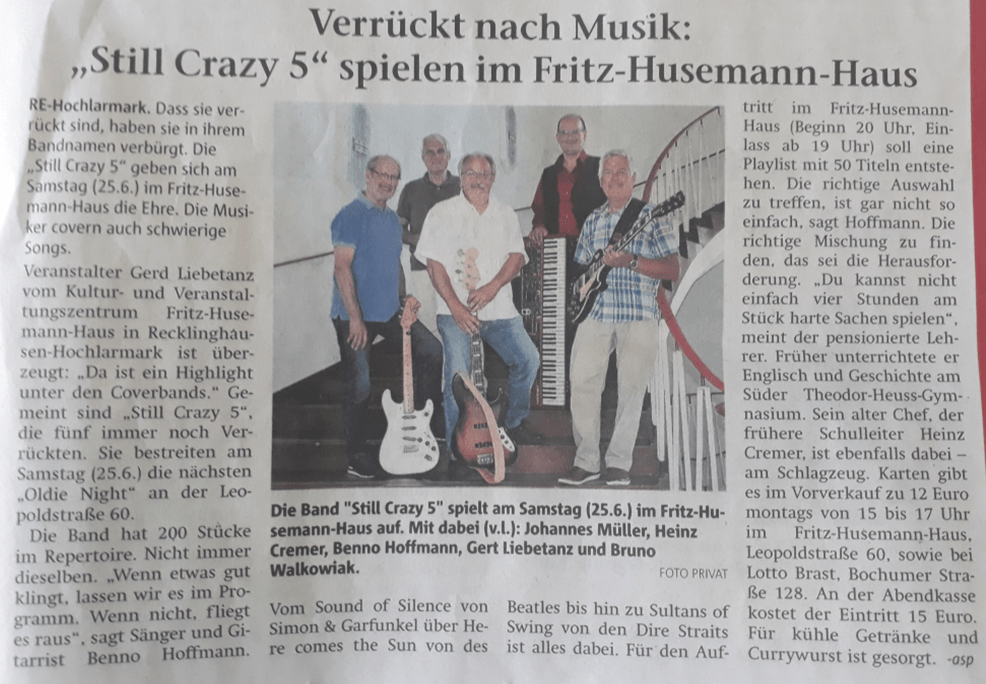 Am Freitag waren die Lokalmatadoren von Still Crazy Five ab 17:30 Uhr wieder die Opener und sorgten mit ihren kleinen und großen Fans sowie vielen Freunden und Bekannten dafür, dass die Veranstaltung von Anfang an gut besucht war.